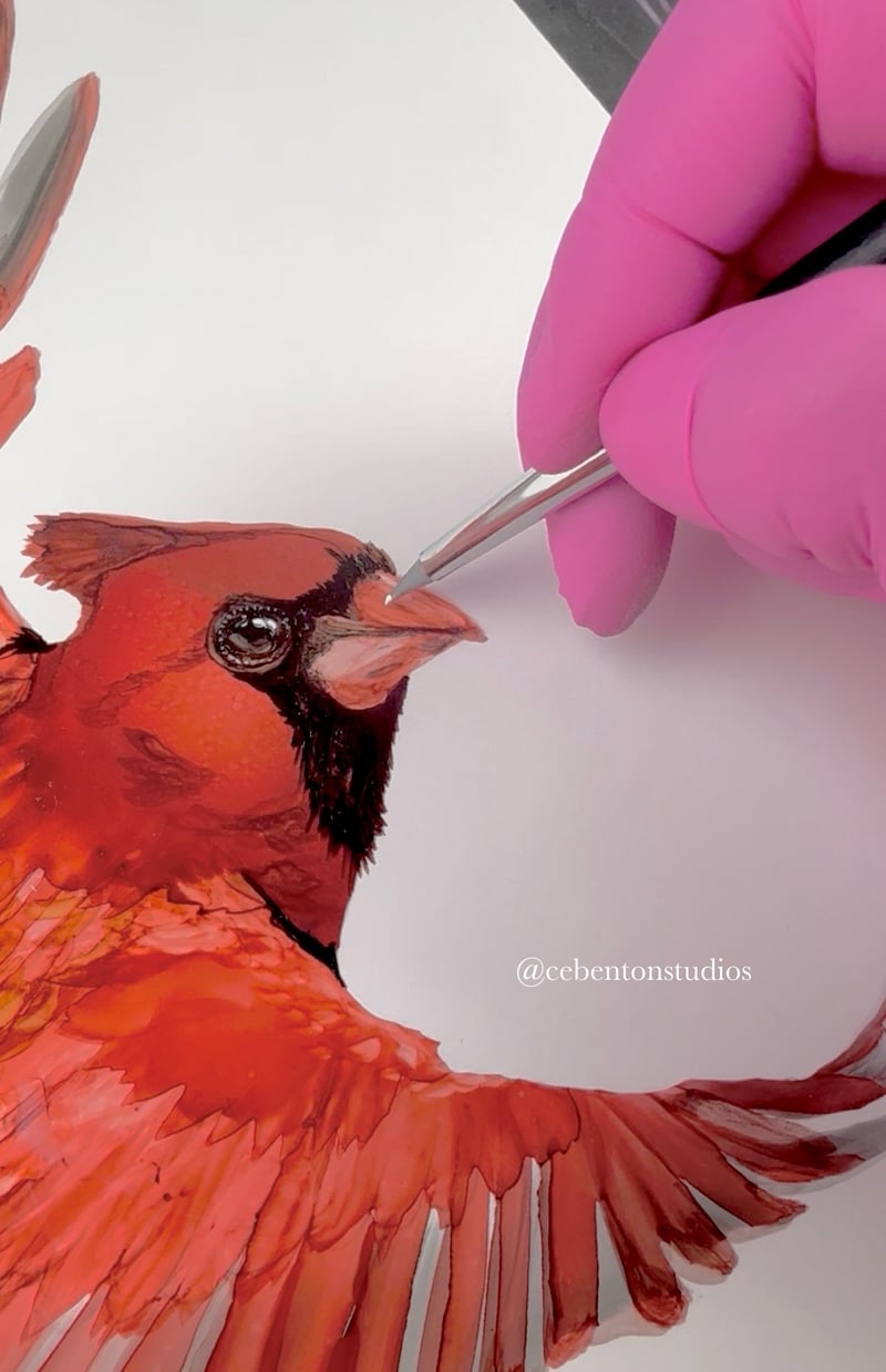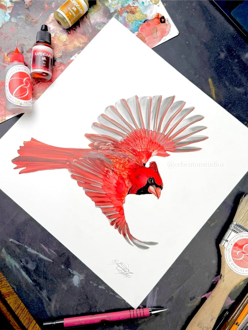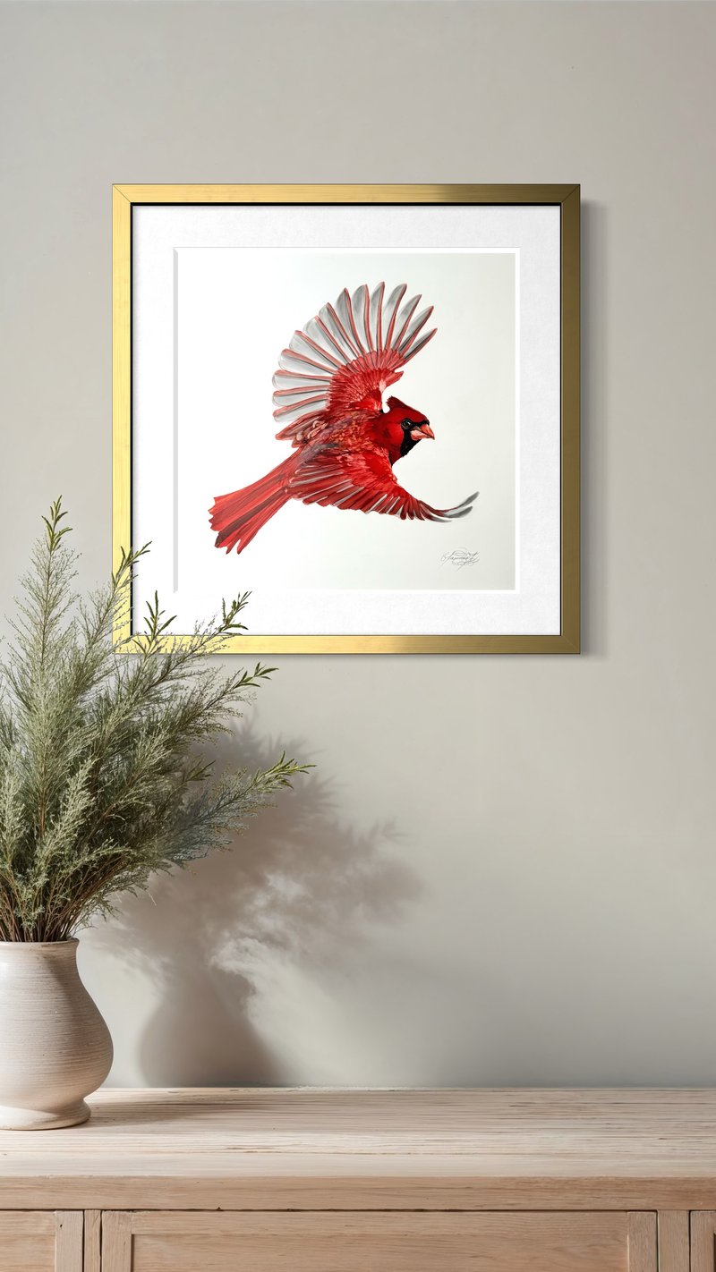 Male cardenal in flight painted with Alcohol Ink & mixed-media - Legion heavy Yupo Synthetic bright white paper 144lb (390 gsm). Framed with UV conservation protective glass with premium gold metal frame.