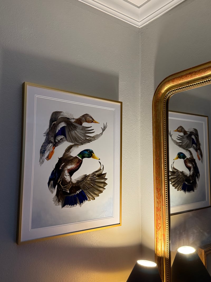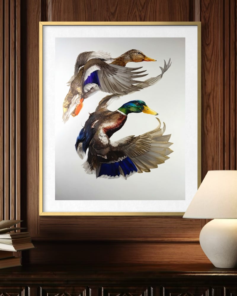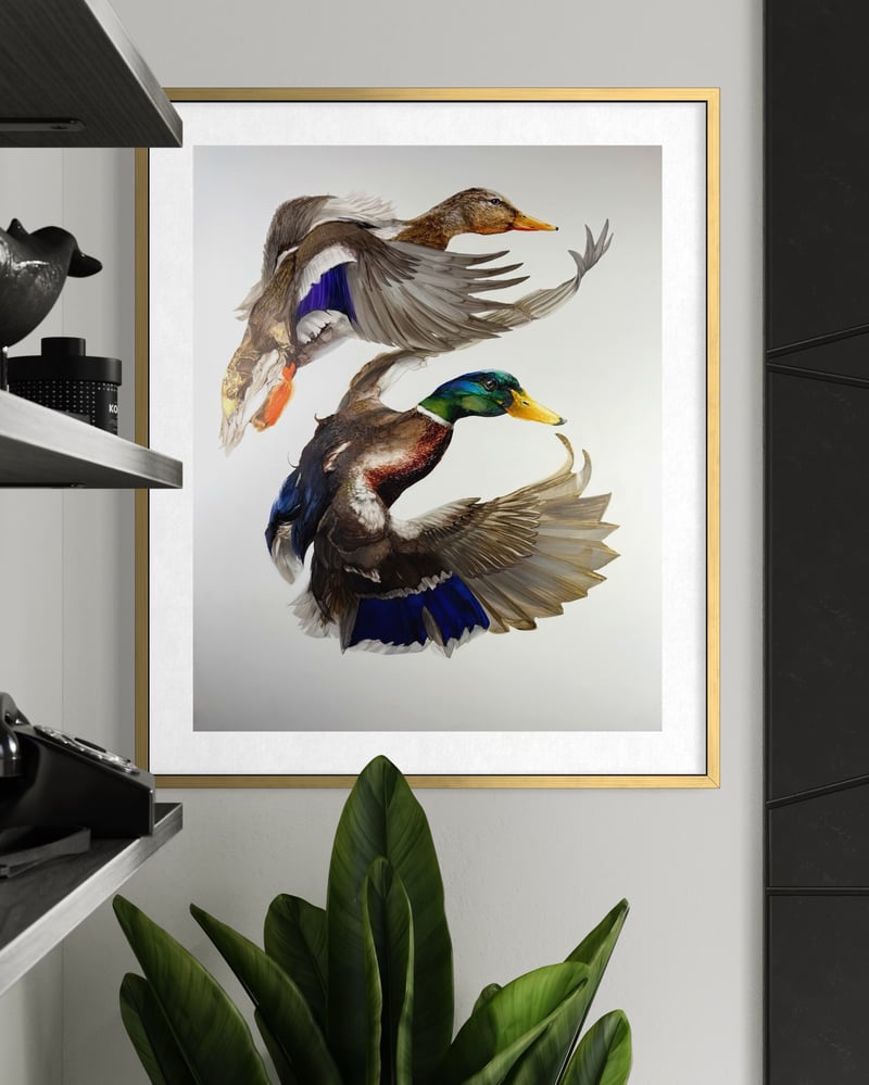 A couple of mallard ducks in flight sharing in harmony, created with Alcohol Ink technique with 24K details on feathers, on bright white Legion heavy Yupo synthetic paper, 144 lb (390 gms).