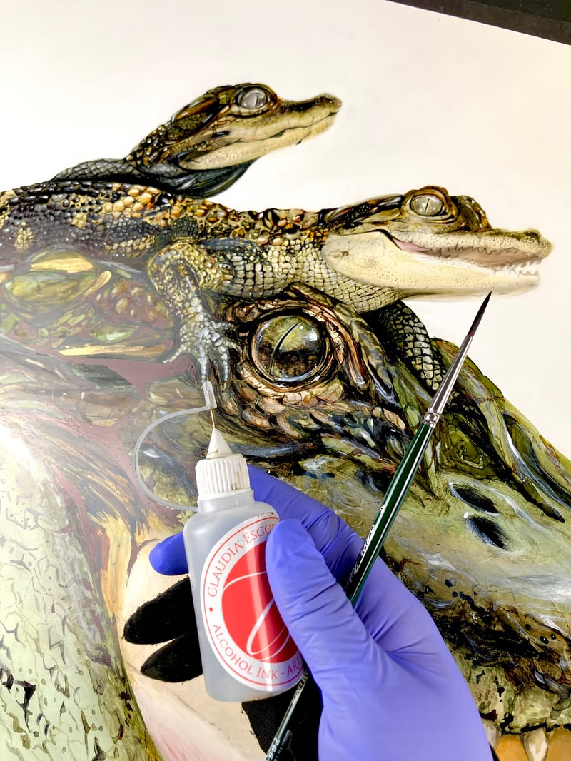 This painting features a mother alligator with tree hatchlings. They are painted with Alcohol Ink & mixed-media detailing gold accents on the scales of each alligator on - Legion heavy Yupo Synthetic bright white paper 144lb (390 gsm), custom framing in a studio with double mat and Conservation Museum Glass.