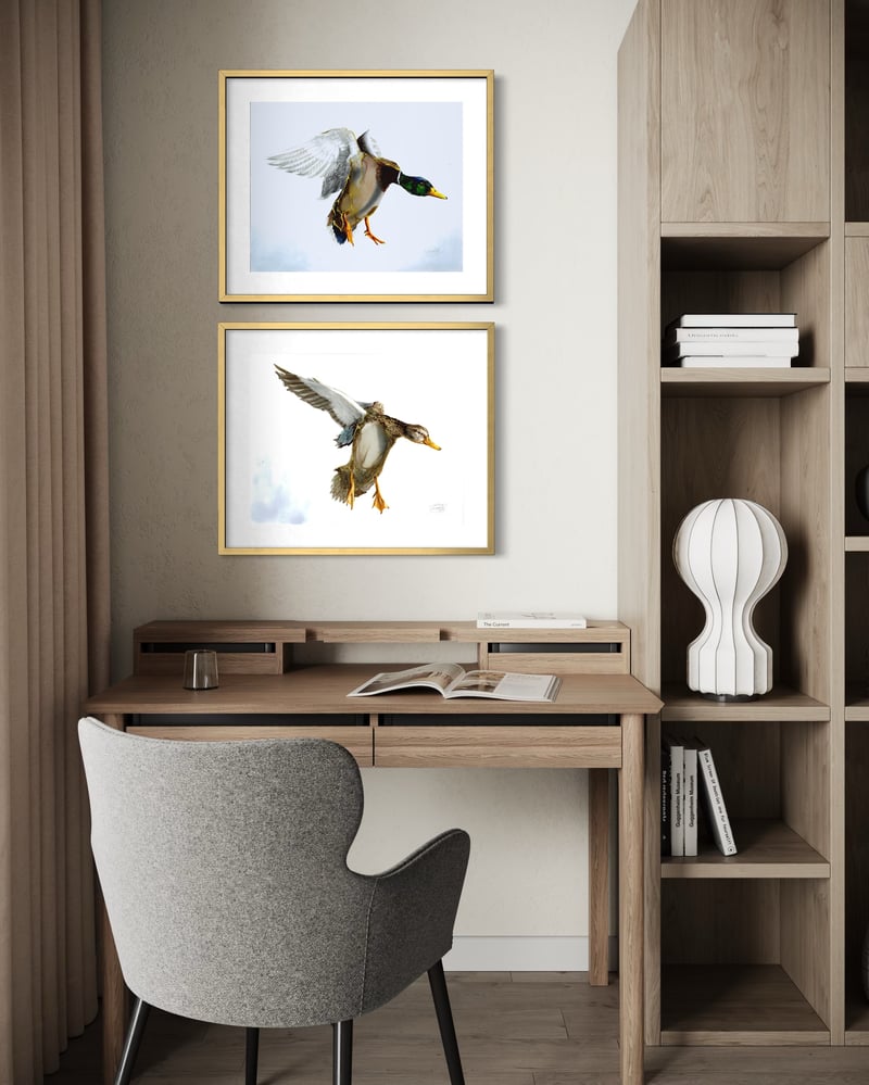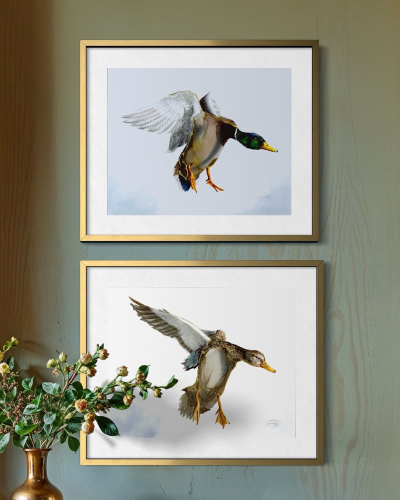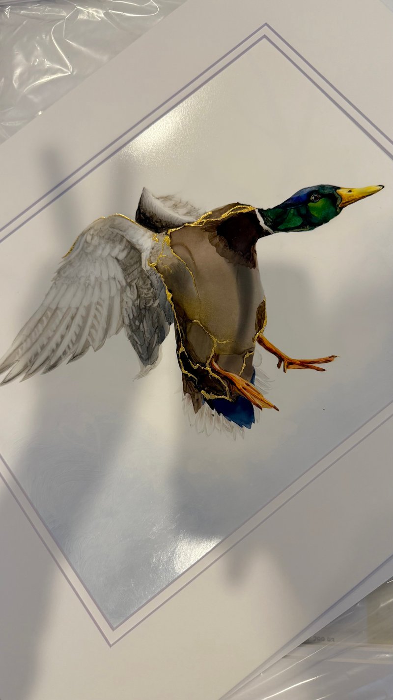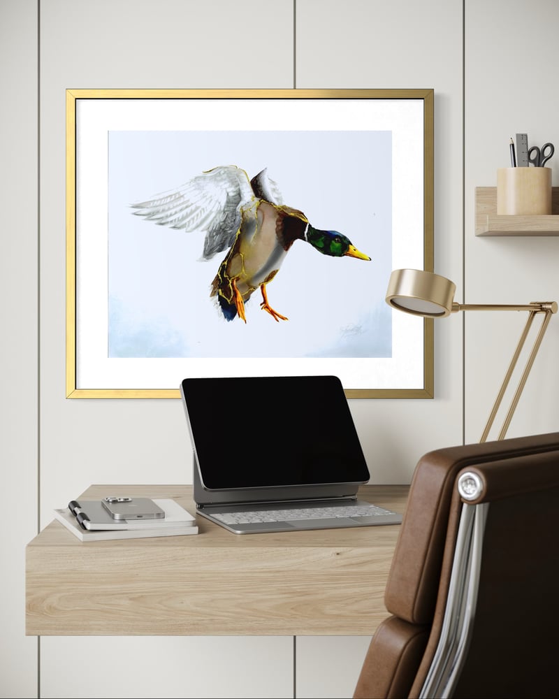 Male mallard duck making its landing, created with Alcohol Ink technique with 24K details on feathers, on bright white Legion heavy Yupo synthetic paper, 144 lb (390 gms).